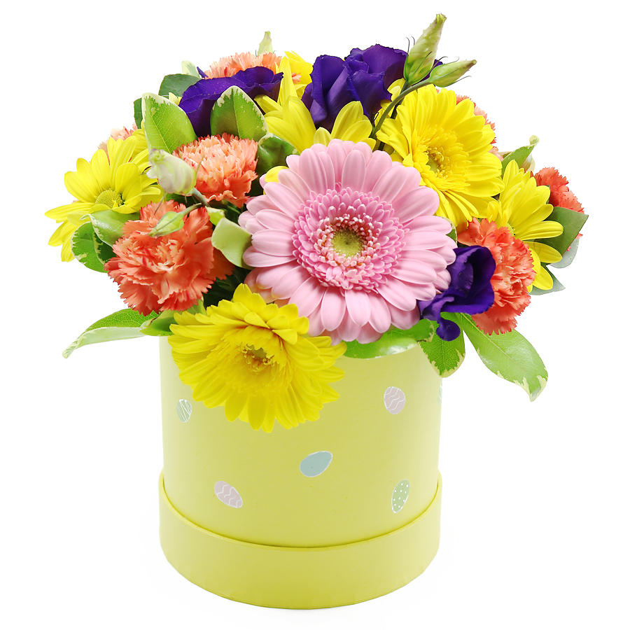 Easter is the time to rejoice and be thankful for the gift of life, love and joy. Let your joy burst forth like flowers in the spring! Express your love and devotion with this lovely combination of pink and yellow gerberas, orange carnations, purple lisianthus and fresh greenery!